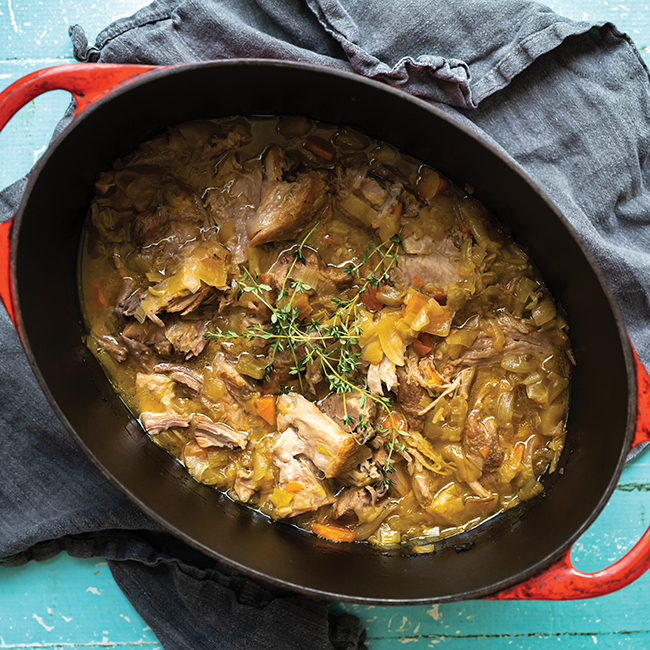 Just before serving, remove and discard the bay leaf, the pork bone and any excess skin. Gently pull the pork apart into big chunks, folding it into all the juices.