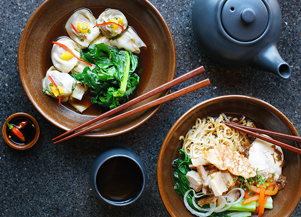 with cooked wontons and blanched vegetables.